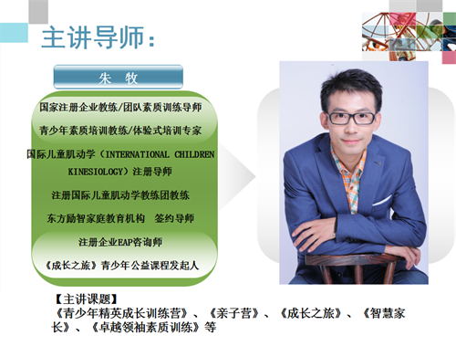 【主講課題】《青少年精英素質(zhì)訓(xùn)練營》、《親子營》、《卓越領(lǐng)袖素質(zhì)訓(xùn)練》、《成長之旅》、《游戲調(diào)和101》、《愛孩子系列工作坊》、《智慧家長》等。